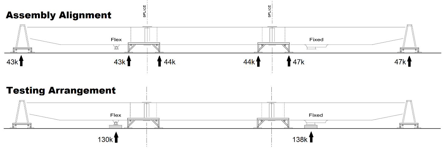 Assembly stands were used to set the camber and alignment by providing vertical adjustment using threaded crossbars and lateral adjustment using Teflon slide bearings. Next, test stands raised the girders off the assembly stands and supported the girders from the leg attachment locations. Supporting from the leg attachment locations simulated the unloaded configuration of the girders and allowed verification of the alignment and camber requirements.