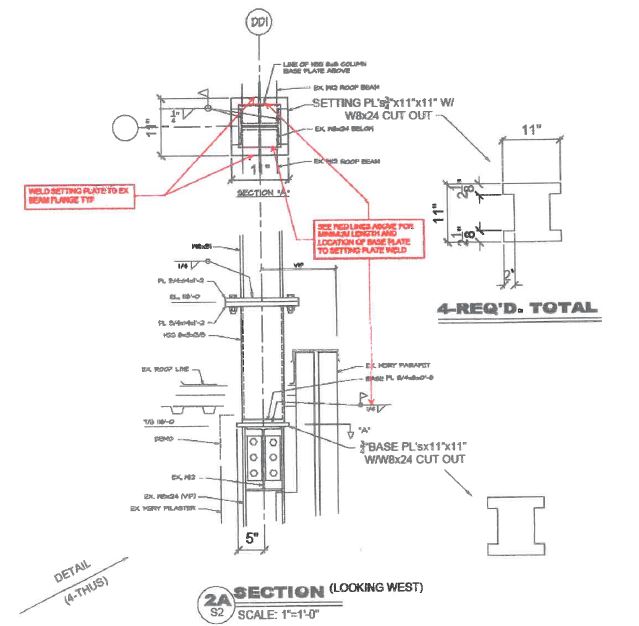 We contacted the engineer of record and suggested the following procedure as an alternative. We fabricated a setting place cut to allow fillet welding to the top of the existing column flanges and weldable to the top of the two existing connecting beams. (The top of the column was flush with the top of the connecting beams.) We prefabricated tube stub columns with baseplates and then field welded the base plates to the setting plates. We decided to install a prefabbed tube stub column to make roof flashing easier and reduce the roofing time required. We then shot the top of the stub columns shop fabricated a new column designed for correct elevation, and bolted the new fabricated columns to the stub column. The engineer of record agreed with the procedure saving the cost of masonry and parapet demolition and simplifying the roofing required.